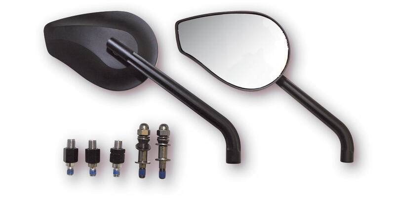 Cromozott alumínium tükör ovális vágással és hajlított kartámasszal. Tartalmaz extra adaptert Harley Davidson és Yamaha modellekhez, E-jelzéssel ellátva.